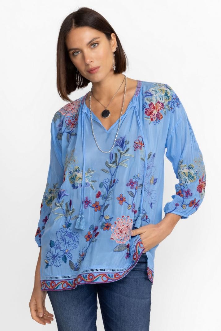 Halenka Melisa Zadonia je vyrobena z lehké látky s nádechem streču a volně splývá v ženské siluetě. Tento vyšívaný top s rozděleným výstřihem do V, střapci a řasením u krku a elastickými rukávy vyniká svou výraznou modrou barvou a květinovými ozdobami. Vyvážený a sofistikovaný vzhled dodá halence v kombinaci s bílými kraťasy.