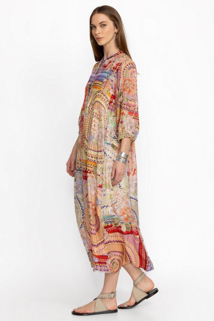 Šaty Garden Mosaic Tile Britta, vyrobené ze 100% hedvábí, dodají každému šatníku zářivou barvu a vzor. Tyto šaty mají zaoblený límec a snadné zapínání na knoflíky a jsou zakončeny krásnou splývavou sukní a odnímatelnou kombinézou. Pro bohatý vzhled plný textur a barev si je můžete obléknout do kombinace s džínovou bundou a espadrilkami na klínku.
