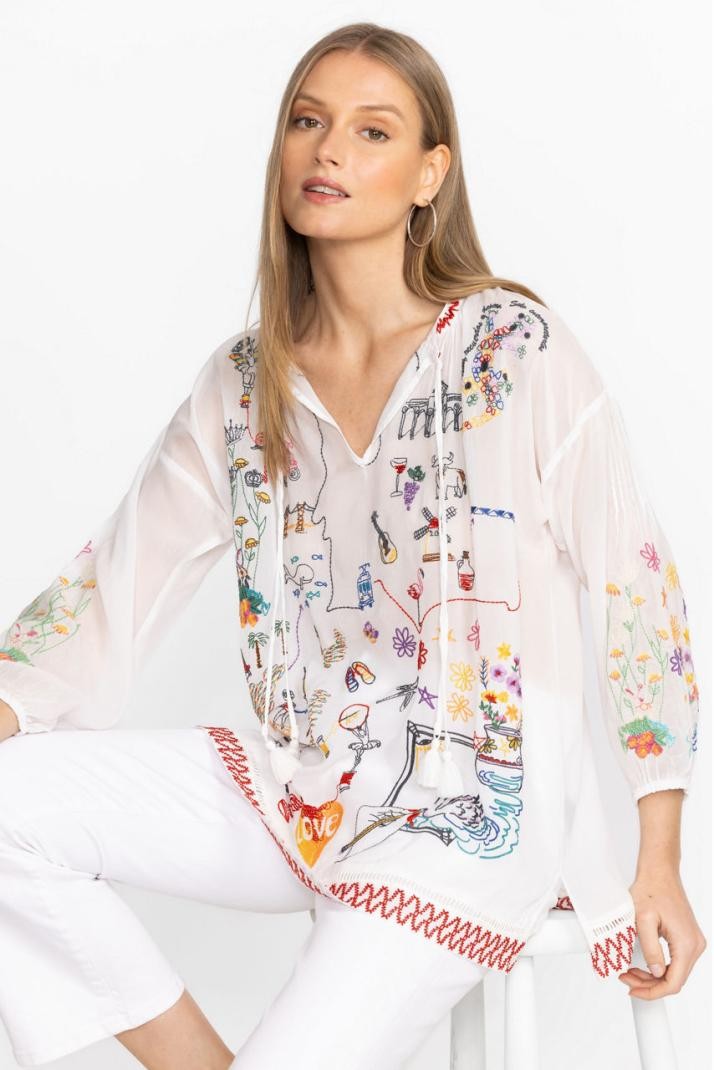 Halenka Zadonia je vyrobena z lehké a lehké látky a je zdobena složitou barevnou výšivkou. Tato halenka volného střihu s rozděleným výstřihem do V zakončeným ozdobnými střapci nabízí lehce spuštěná ramena a nařasené rukávy pro nádech rozmarnosti. Pro víkendové dobrodružství ji zkombinujte s boyfriend džínami a ležérními mokasínami.