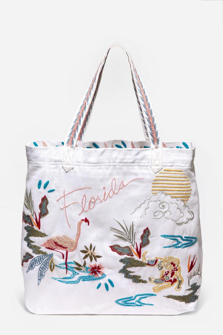 Florida Everyday Tote-tasken er den perfekte måde at fejre "Sunshine State" på, med sine dristige farver fyldt med livlige scener. Denne farverige broderede tote-taske er fremstillet af 100% bomuld med et rummeligt indre og giver dit daglige look et strejf af finurlighed. Kombiner den med en dristig top og neutrale shorts til en dag ved poolen med vennerne.