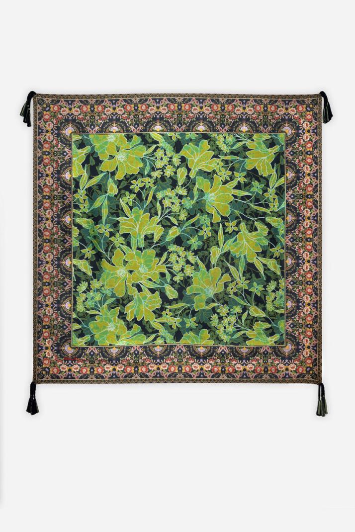 Hirz-tørklædet er spundet af overdådig silke og forvandler et klassisk tilbehør til et statement-stykke til den nye sæson. Tørklædet er forestillet i et grønt farveskema og fremhæves af et iøjnefaldende print, en kontrastkant og kvaster i hjørnerne. Style det med en midikjole for et tidløst feminint look.