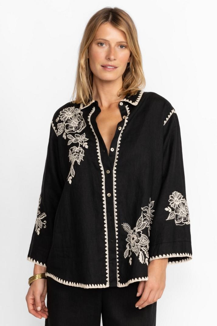 Addison Kimono-ærmeskjorten tilbyder et friskt nyt bud på en klassisk silhuet og kombinerer traditionel skjortestil med et strejf af elegance. Denne smukke bluse med knaplukning er fremstillet af 100% hør og dekoreret med fint placeringsbroderi, og har generøse ærmer, der falder elegant væk fra kroppen. Kombiner den med vide hørbukser for et elegant, afslappet look.