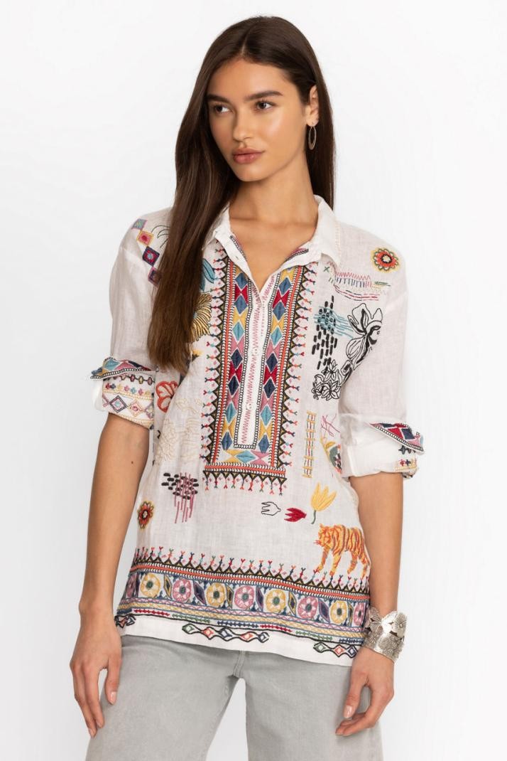Confeccionada en lino 100% transpirable, la blusa Simmie ofrece una audaz combinación de colores eclécticos. Presenta un cuello camisero acentuado con una tapeta bordada en la parte delantera, y está elaborada con intrincados detalles de bordados coloridos. Combínala con vaqueros de colores y bailarinas de piel para un look fresco y sofisticado.