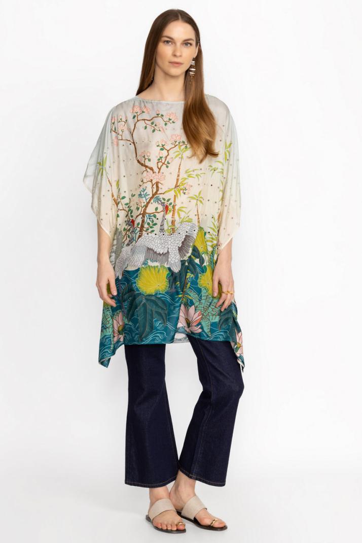Eloisalla luonnonkauniilla kuvioinnilla koristeltu Pribasa Eyelet Poncho on klassisen eleganssin huippu. Tämä tunikapituinen poncho on valmistettu 100 % laskeutuvasta silkistä ja siinä on kauttaaltaan silkkireunuksia. Siinä on kevyesti pyöristetty pääntie ja rennot dolman-hihat. Yhdistä istuvien housujen kanssa ja lisää kimaltelevia kultaisia asusteita saadaksesi tyylikkään ja ajattoman ilmeen.