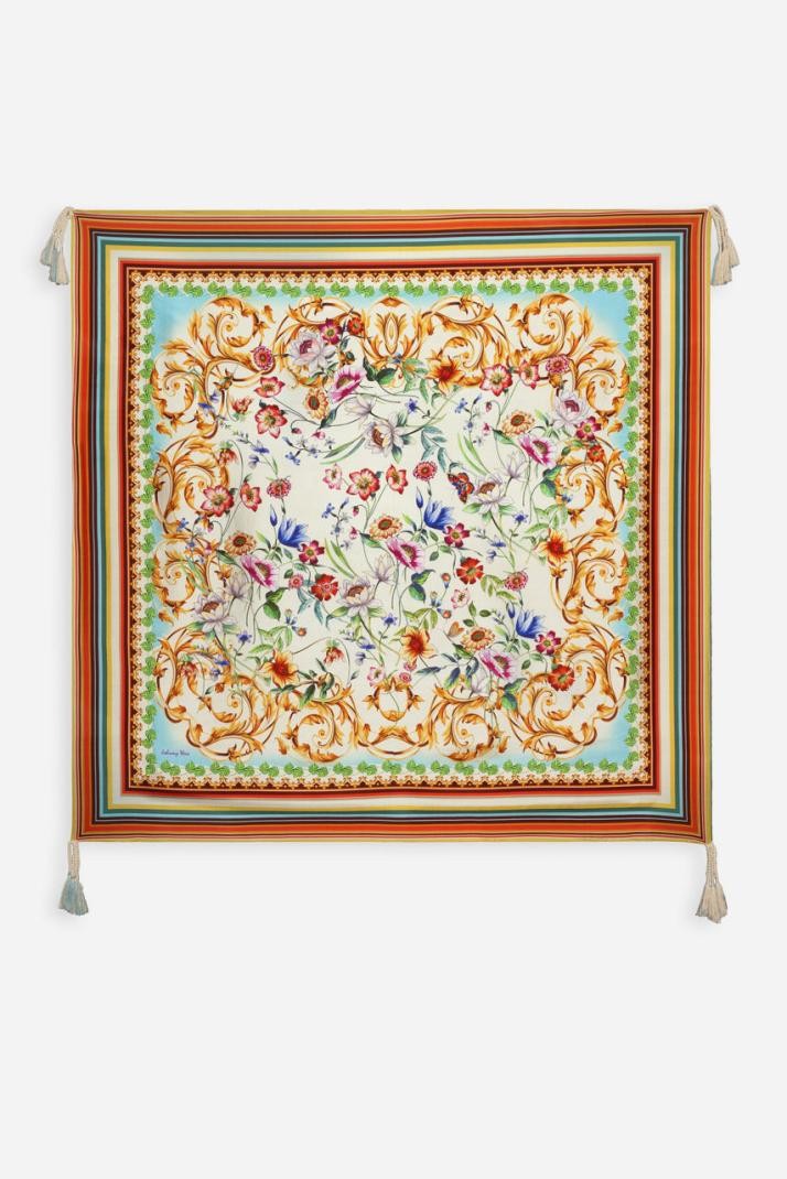 Aikaa kunnioittava asuste, Felix-huivi, on eklektinen muunnelma lumoavasta tyylistä. Tämä huivi on kehrätty nestemäisestä silkistä ja siinä on rohkea raidallinen reunuskuvio, jonka keskellä on eloisia, reheviä kukkia. Ylellisillä tupsuilla viimeistelty klassinen huivi toimii loistavasti kaiken kanssa tyylikkäistä räätälöinneistä liehuviin mekkoihin.