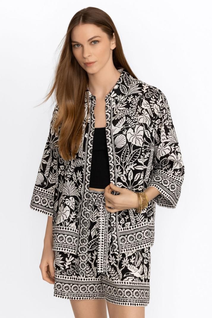 A 100%-ban légáteresztő lenvászonból készült Luciana Kimono ujjú ing élénk, kontrasztos mintával díszített. Hagyományos galléros, gombos elülső részével és lenge kimonó ujjaival ez a laza szabású blúz merész virágokkal díszített, bonyolult részletekkel. Párosítsd fehér lenvászon nadrággal és bebújós papuccsal egy elegáns hétvégi összeállításért.