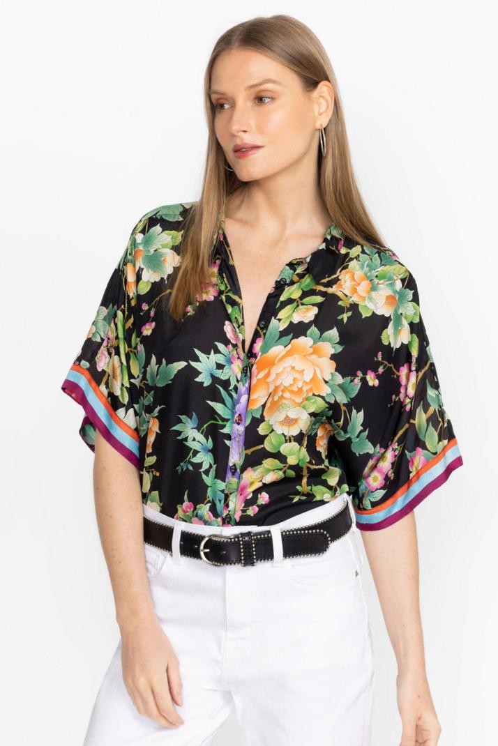 Déanta as 100% síoda sómasach, tá patrún bríomhar, tarraingteach ar an mblús Lynn Button Up. Tá cnaipe ar an mblús seo agus muinchillí Dolman suaimhneacha air, agus tá cuing ar chúl agus imeall cuartha go réidh air. Cuir sciorta ócáideach agus sandals faiseanta leis le haghaidh cuma atá réidh le haghaidh ionaid saoire.