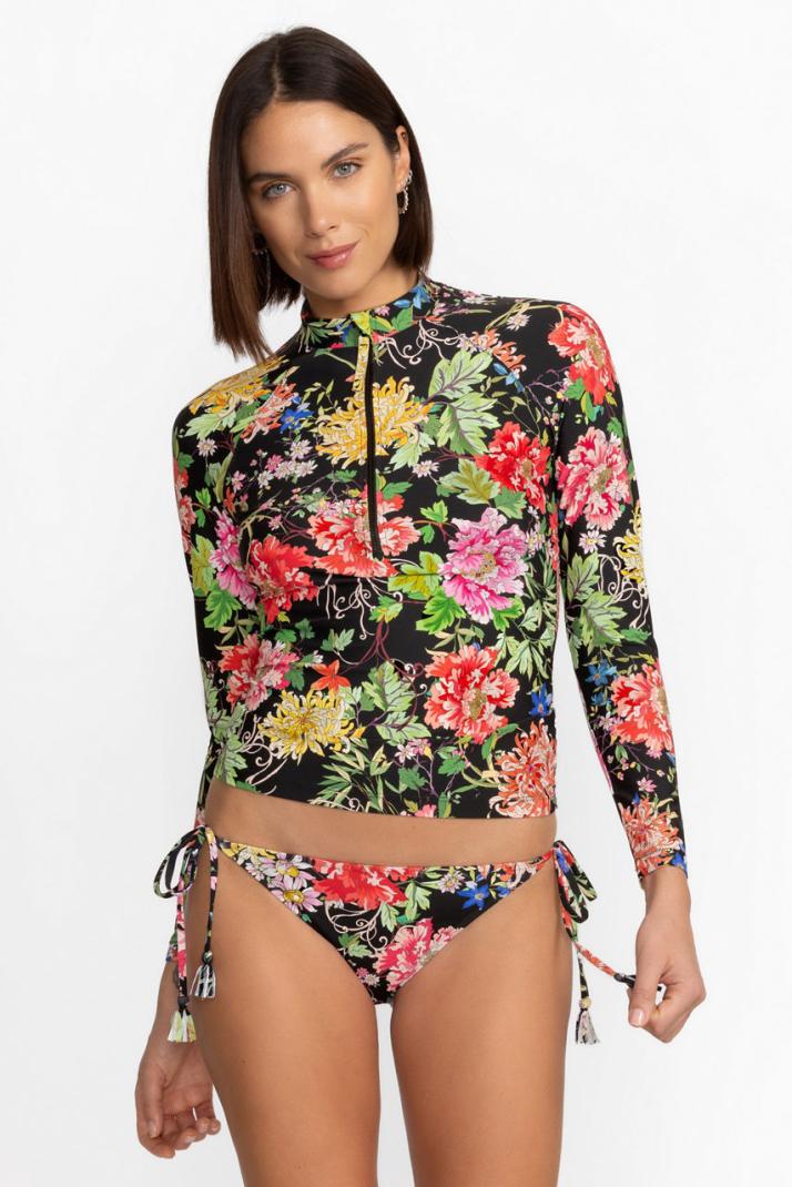 Crafted from a quick-drying fabric with a hint of stretch, the Metalli Mix String Bikini Bottom is adorned with vibrant blossoms. Featuring a traditional bikini cut with side ties, these swim bottoms are finished with decorative tassels. Pair with the Metalli Mix String Bikini Top and the Giorno Ruffle Kimono for an unforgettable poolside look.