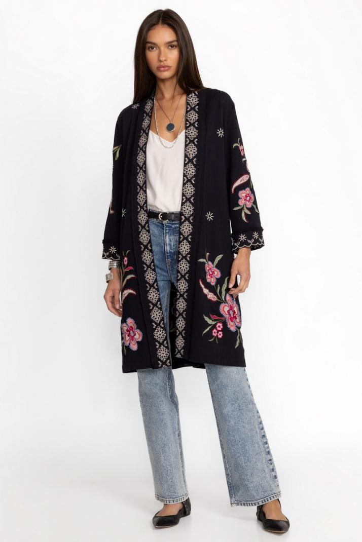 鮮やかな花々が美しく散りばめられたLibbiのフレンチテリー・キモノコートは、目を惹くアウターです。綿100%のこのコートは、繊細な刺繍が施され、オープンフロントとサイドポケットが特徴です。フィット感のあるミディ丈ドレスに重ね着し、ブーツを合わせれば、洗練された雰囲気で夜のお出かけにぴったりです。