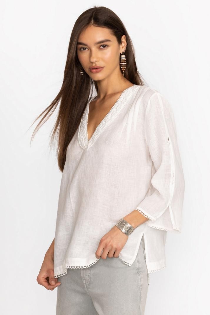 통기성 좋은 100% 리넨 소재로 제작된 슬리브 슬릿이 있는 스플릿 V넥 탑은 여행에 완벽한 룩을 선사합니다. 깊은 V넥라인에 대비되는 테두리가 돋보이는 이 튜닉 길이의 탑은 소매 슬릿과 여유로운 플리츠 보디스로 세심하게 디자인되었습니다. 몸에 딱 맞는 팬츠와 편안한 플랫슈즈와 함께 매치하면 세련된 캐주얼 룩을 연출할 수 있습니다.