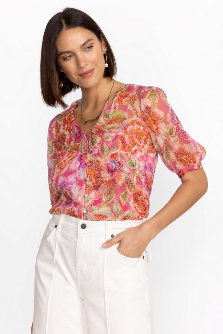 Volánková blúzka Fabiola Marcia, vyrobená zo 100 % hodvábu, ponúka luxusne ženskú siluetu. Táto košeľa s výstrihom do V, ozdobená viacfarebnými kvetmi, má elastické rukávy a podšívku. Skombinujte ju s kraťasmi a klinovými nohavicami pre ležérny denný outfit.