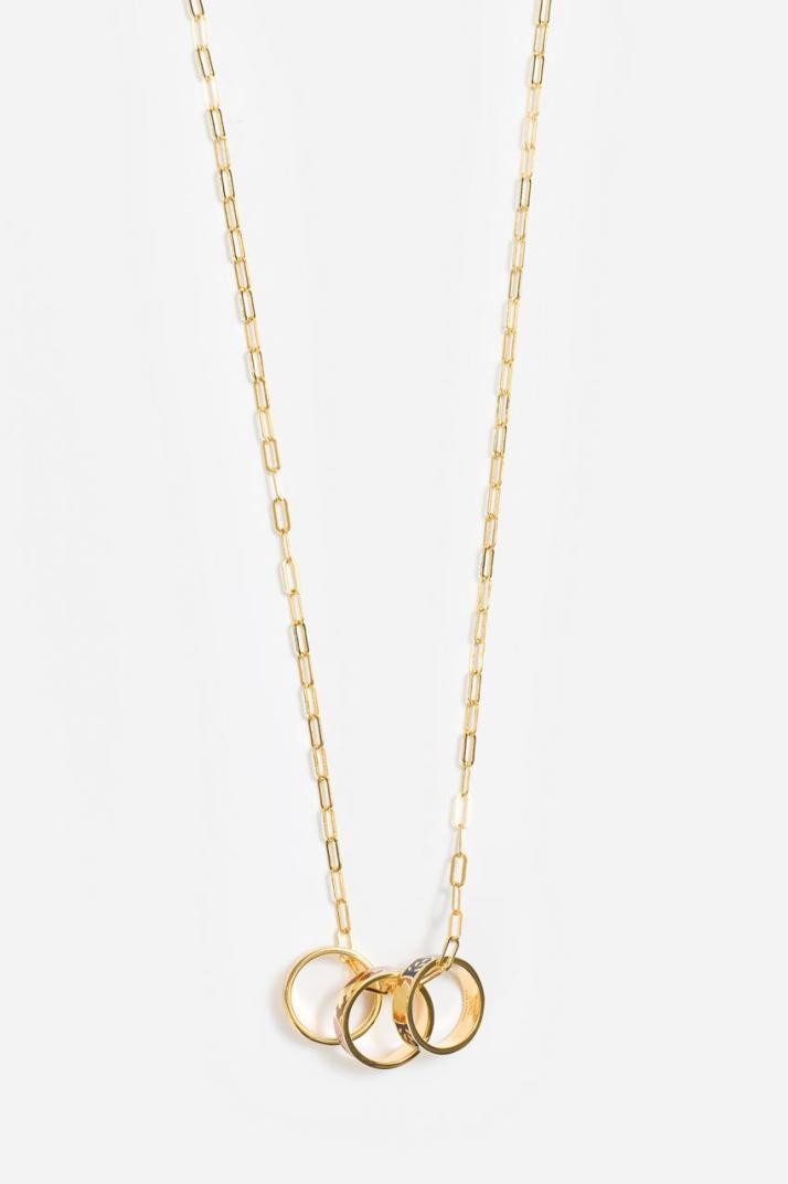 Náhrdelník s 3 prsteňmi zo santalového dreva dodá vášmu cestovnému vzhľadu farebný nádych a je umeleckou kombináciou farieb a lesku. Tento úžasný náhrdelník s tromi unikátne vytvorenými smaltovanými krúžkami, ktoré umelecky visia na mosadznej retiazke, je ústredným prvkom módneho outfitu. Na deň cestovania ho skombinujte so smaltovanou manžetou zo santalového dreva a pohodlným overalom.