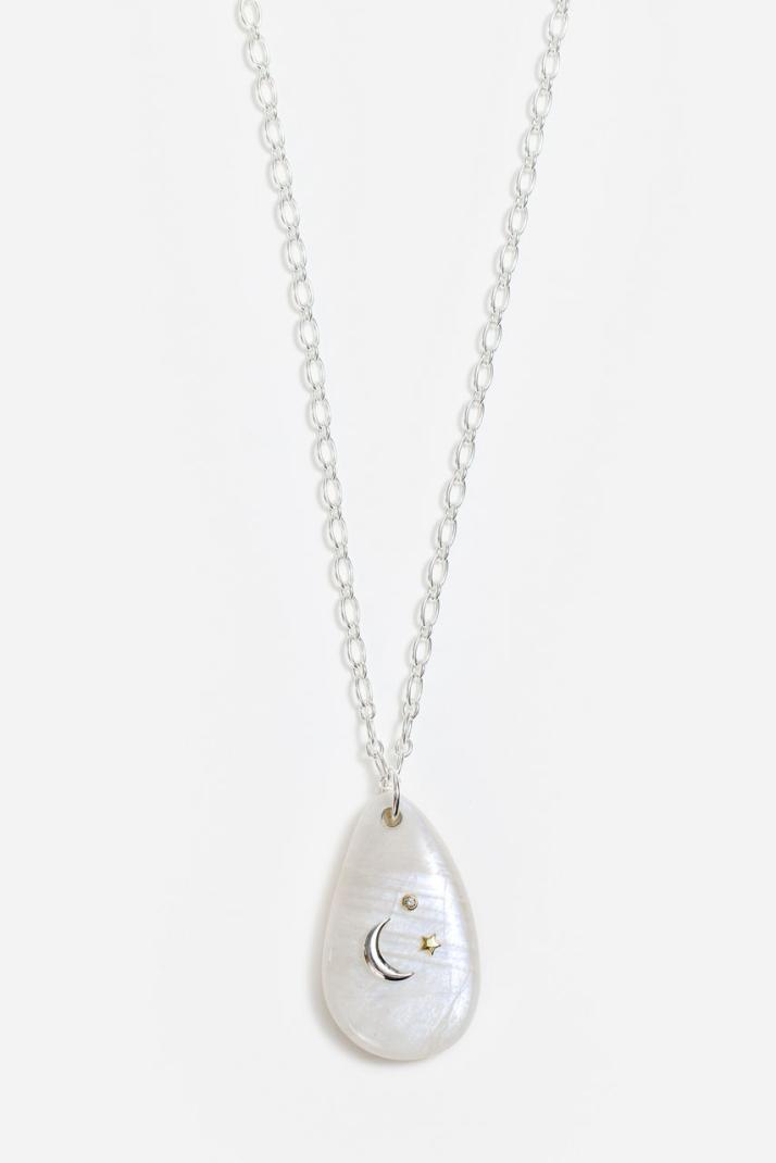 Capturing celestial wonder in a unique jewelry piece, the Moonlight Moonstone Necklace is crafted from a custom cut and polished natural stone. Featuring a sterling silver inlay moon and a bezel set cubic zirconia, this lovely piece sparkles at any hour. Pair with a linen pant set and easy lip on sandals for a relaxed look perfect for a weekend away.